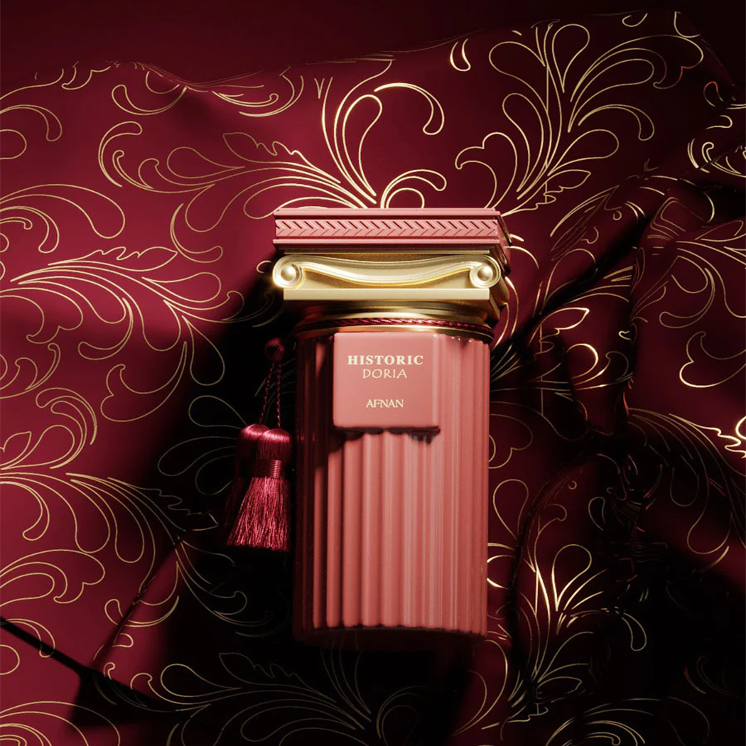 Afnan Historic Doria EDP has a floral scent that balances feminine and masculine notes, inspired by Greek heritage.
