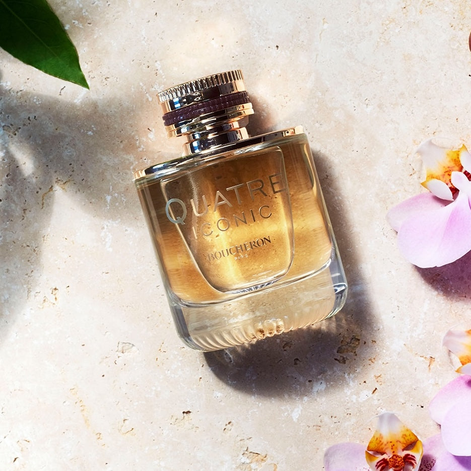 Boucheron Quatre Iconic EDP smells of bitter orange, jasmine, rose, golden woods, and musk, creating a chic, alluring aroma.