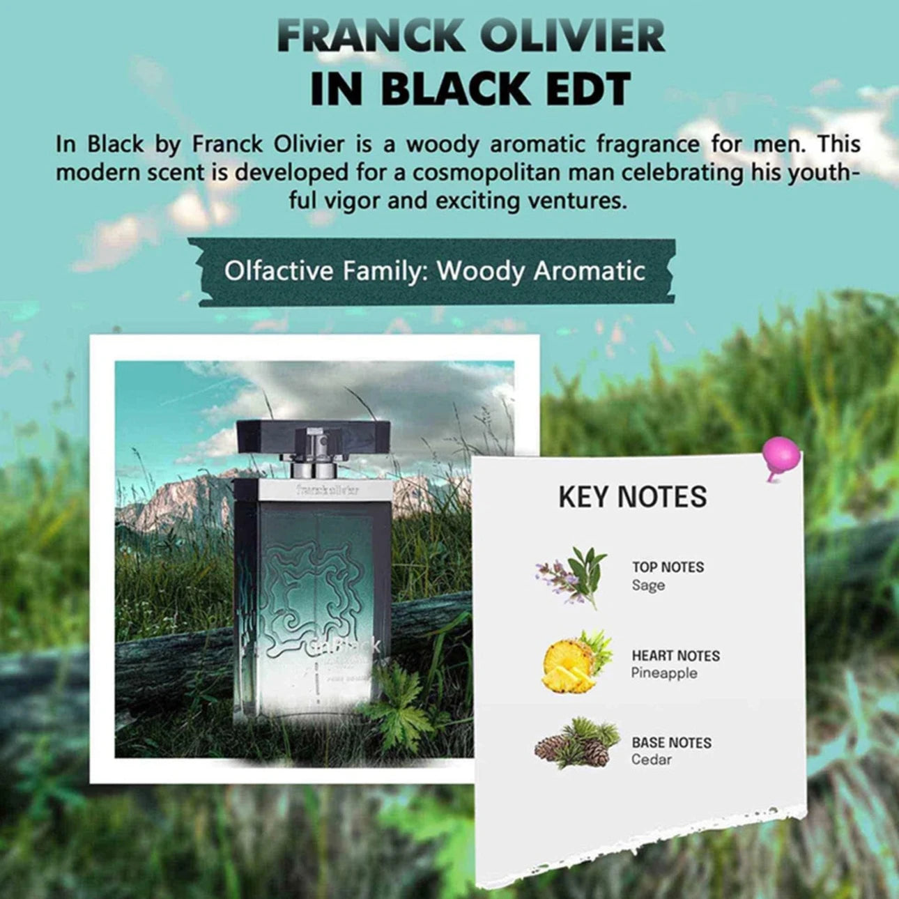 - Woody Aromatic fragrance for men.