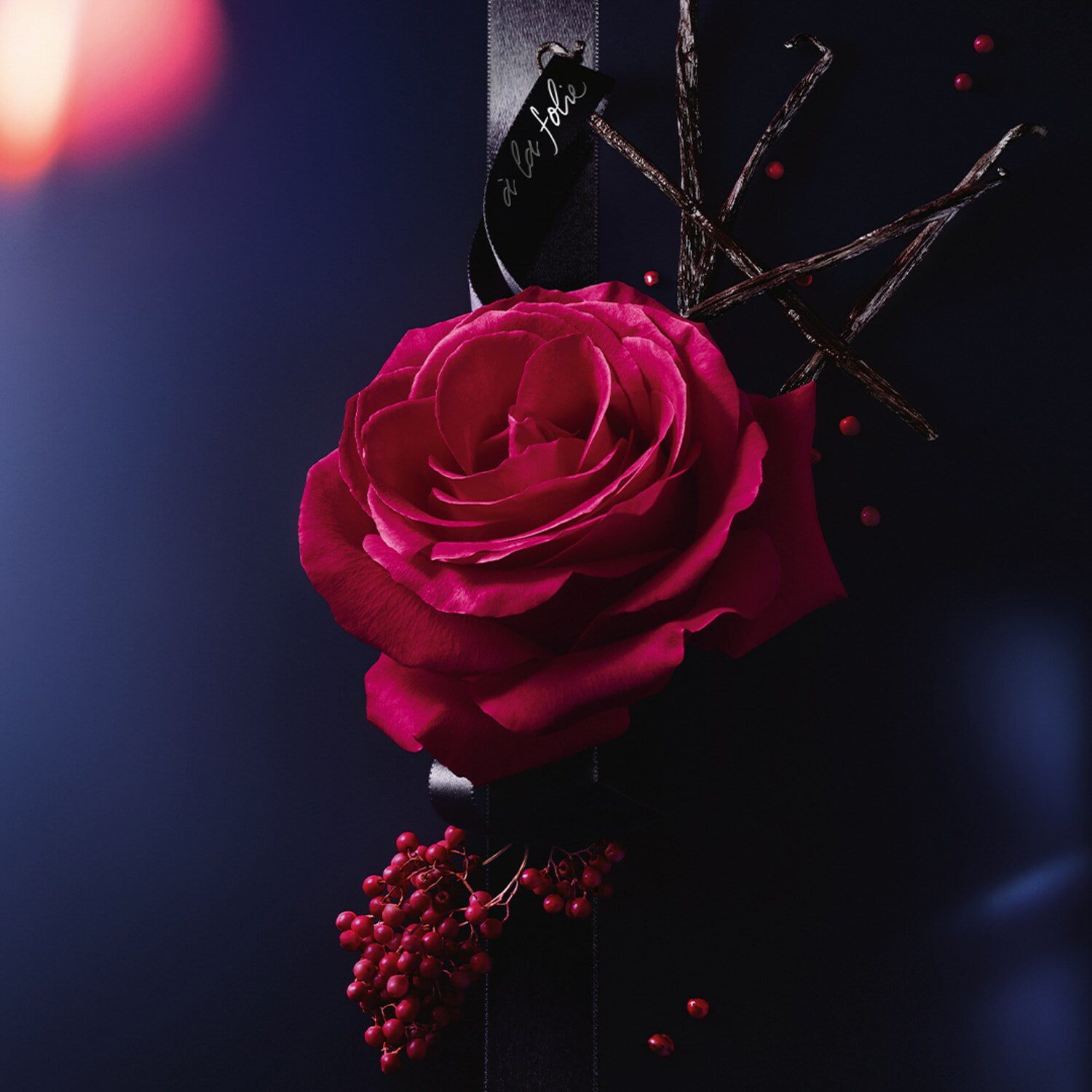 Lancome La Nuit Trésor À La Folie smells of sweet raspberry, jasmine, rose, with a warm vanilla, tonka bean, and patchouli finish.