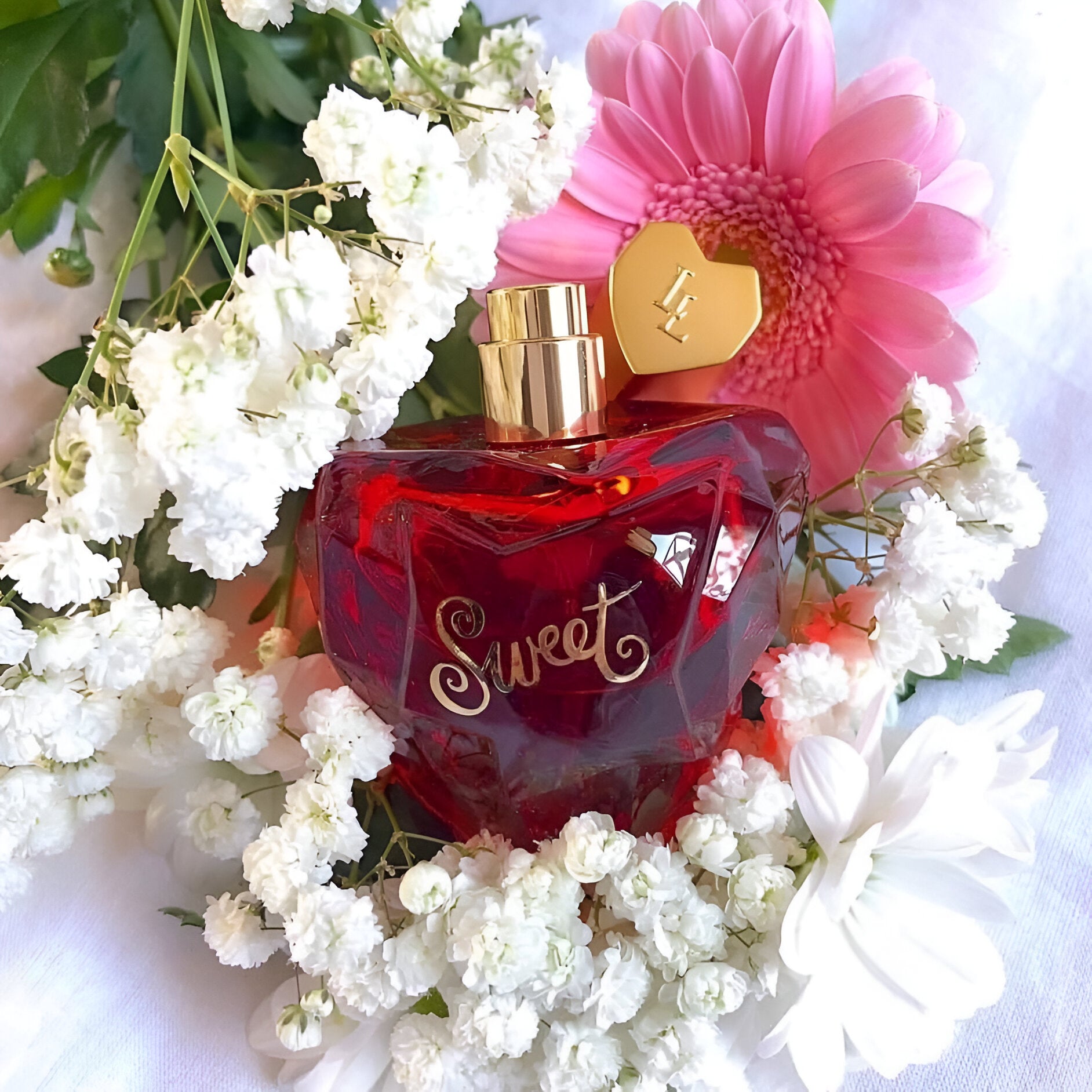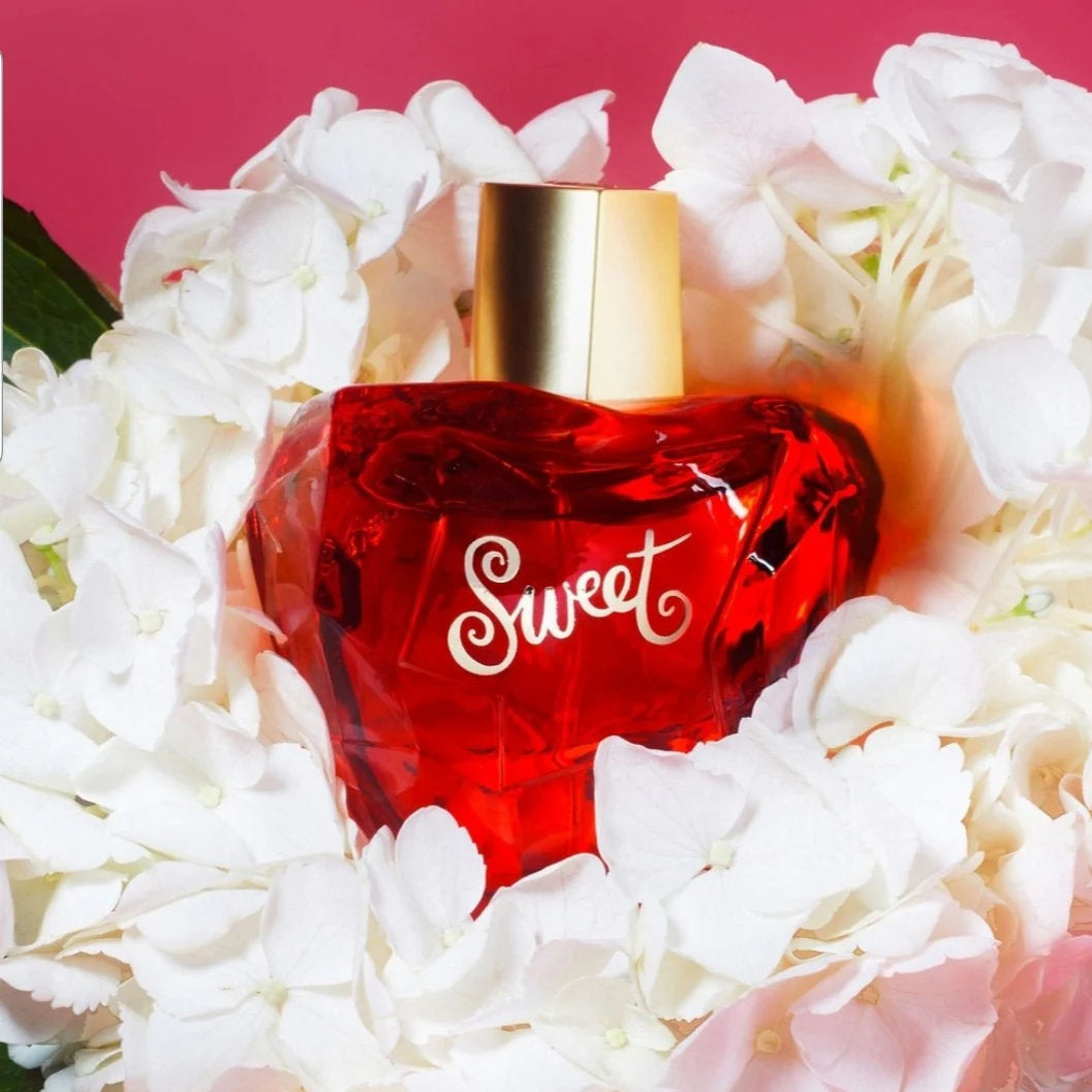 Lolita Lempicka Sweet EDP smells like a delightful blend of spicy vanilla, sour cherry, and sugary cocoa, with delicate floral hints from iris and angelica.