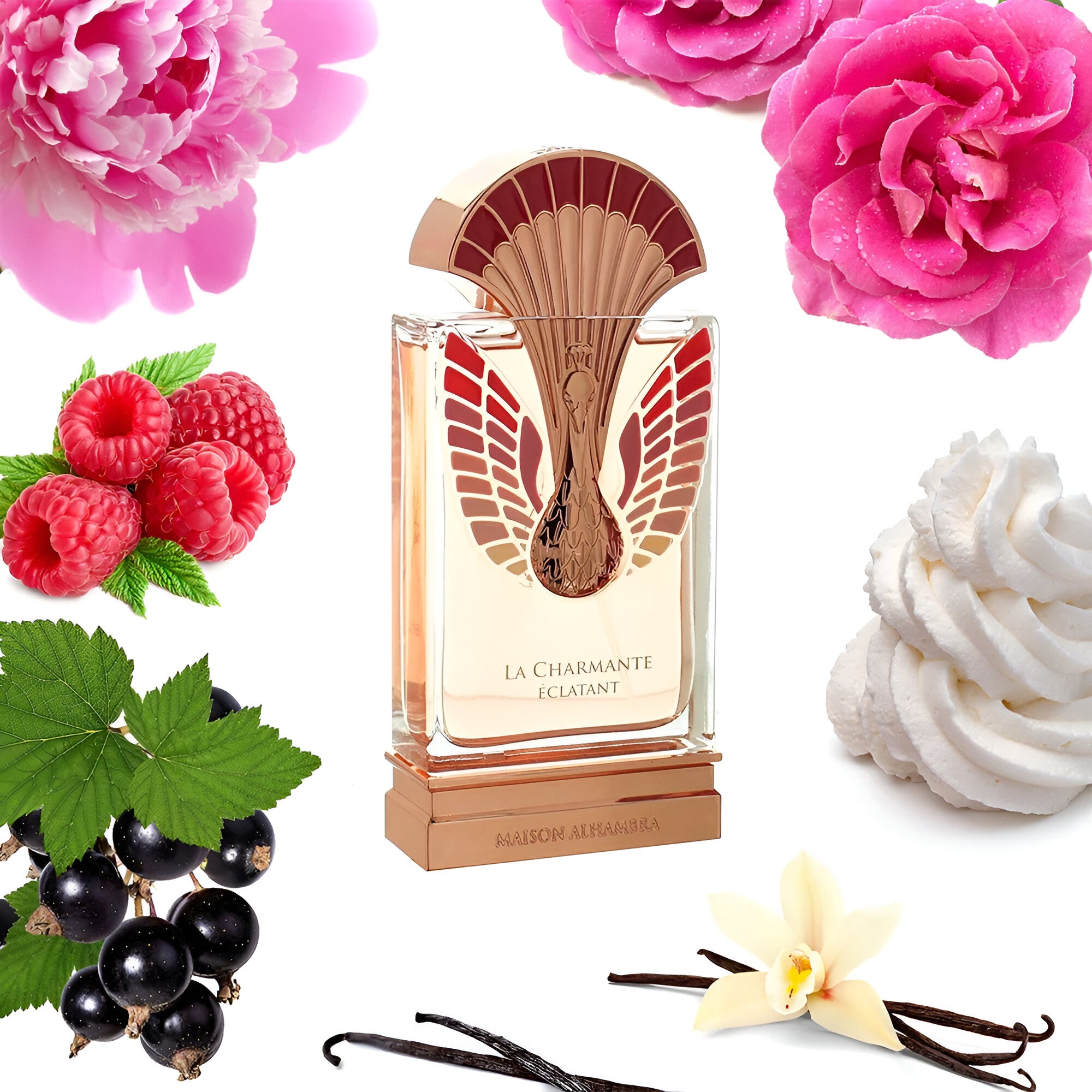 Maison Alhambra La Charmante Eclatant EDP smells like a delightful mix of fresh blackcurrant and raspberry, soft rose and peony flowers, all wrapped in a warm, creamy vanilla base, making it both fruity and floral.