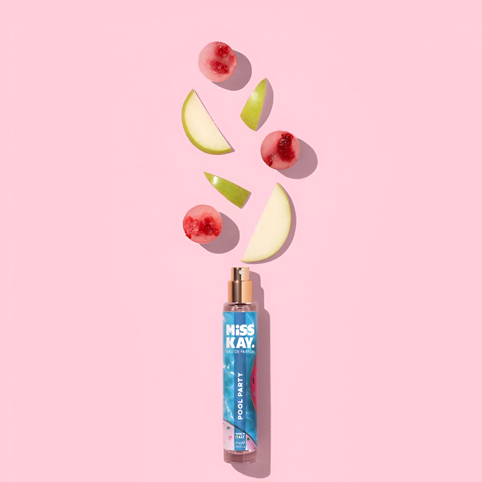Miss Kay Pool Party EDP smells like a refreshing blend of juicy watermelon and crisp green apple, layered with soft floral notes of freesia and lily-of-the-valley, capturing the joyful essence of summer fun by the pool.