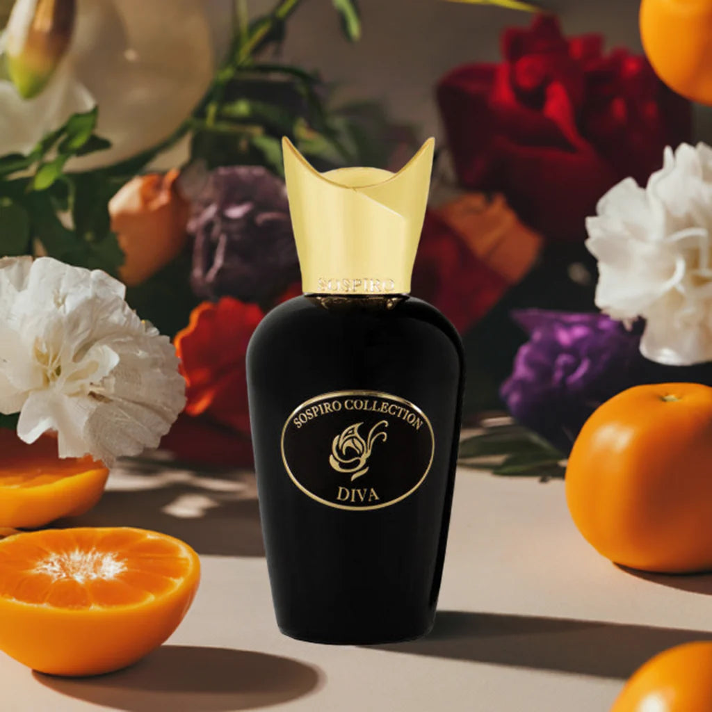 Sospiro Diva EDP smells like a bright, fruity opening of mandarin and peach that blossoms into rich, romantic florals (carnation, jasmine, rose) and settles into a warm, powdery, creamy base of iris, sandalwood, labdanum, vanilla, and soft musk.
